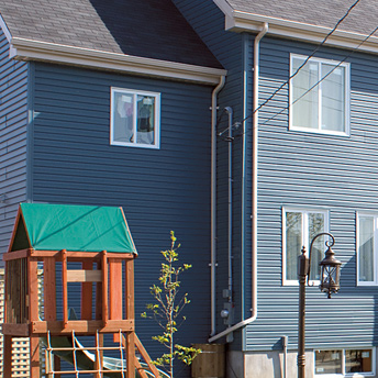 Downspout a vertical enclosed pipe which is attached to the side of the home.